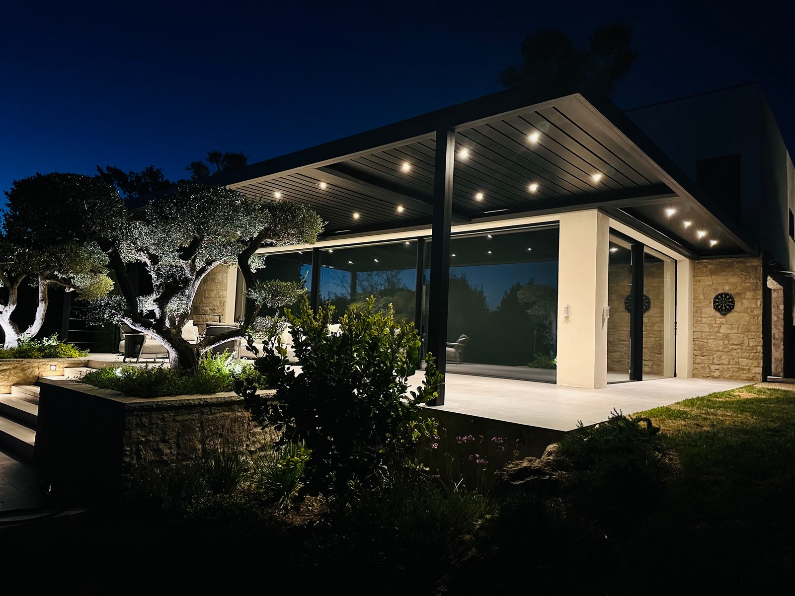 Fabrication et pose d’une pergola à toit fixe avec éclairage spots à led à réglage d’intensité. 👌🏻✨